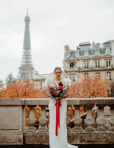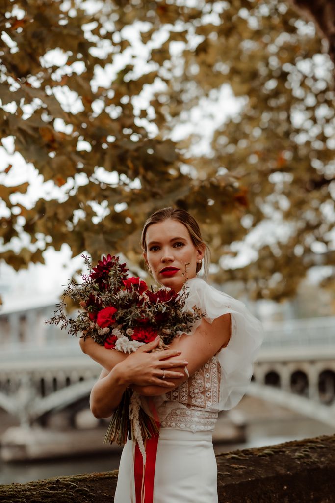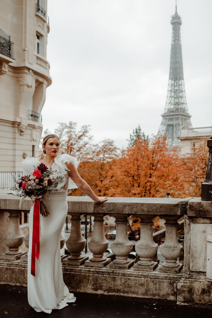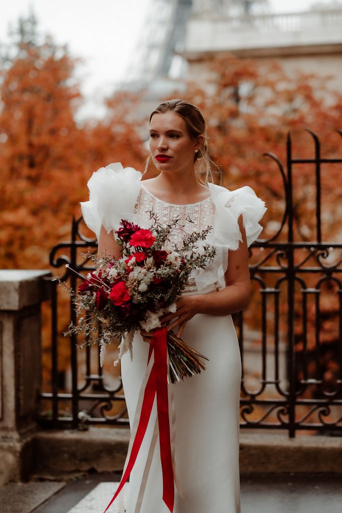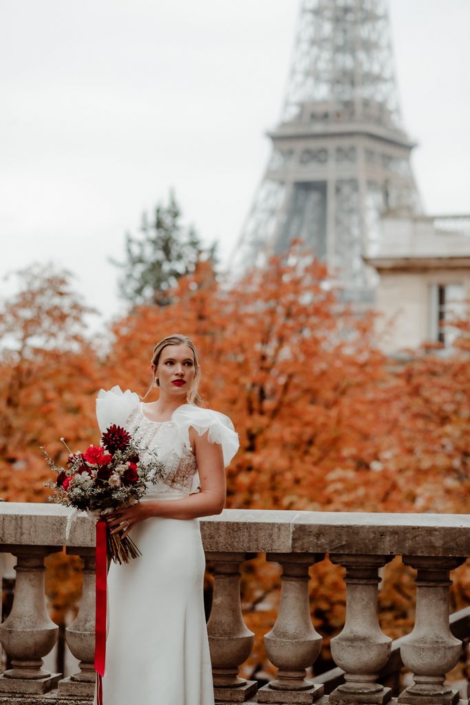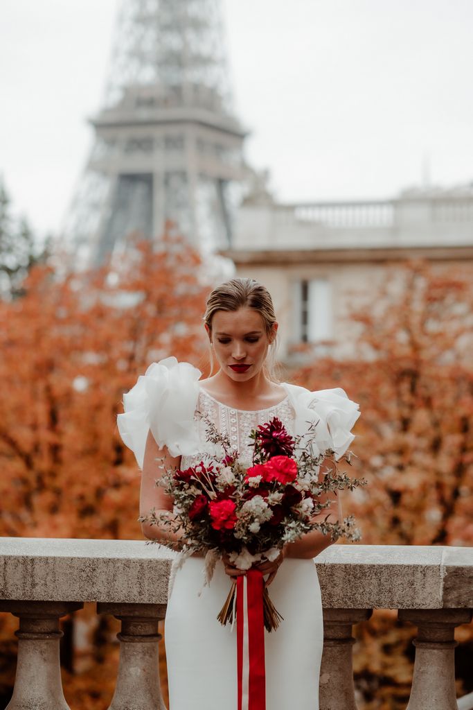 The metallic silhouette of the Eiffel Tower brings a strong, almost graphic contrast to the passionate red accents that set the tone: a fiery bouquet, a signature red lip, a confident allure.