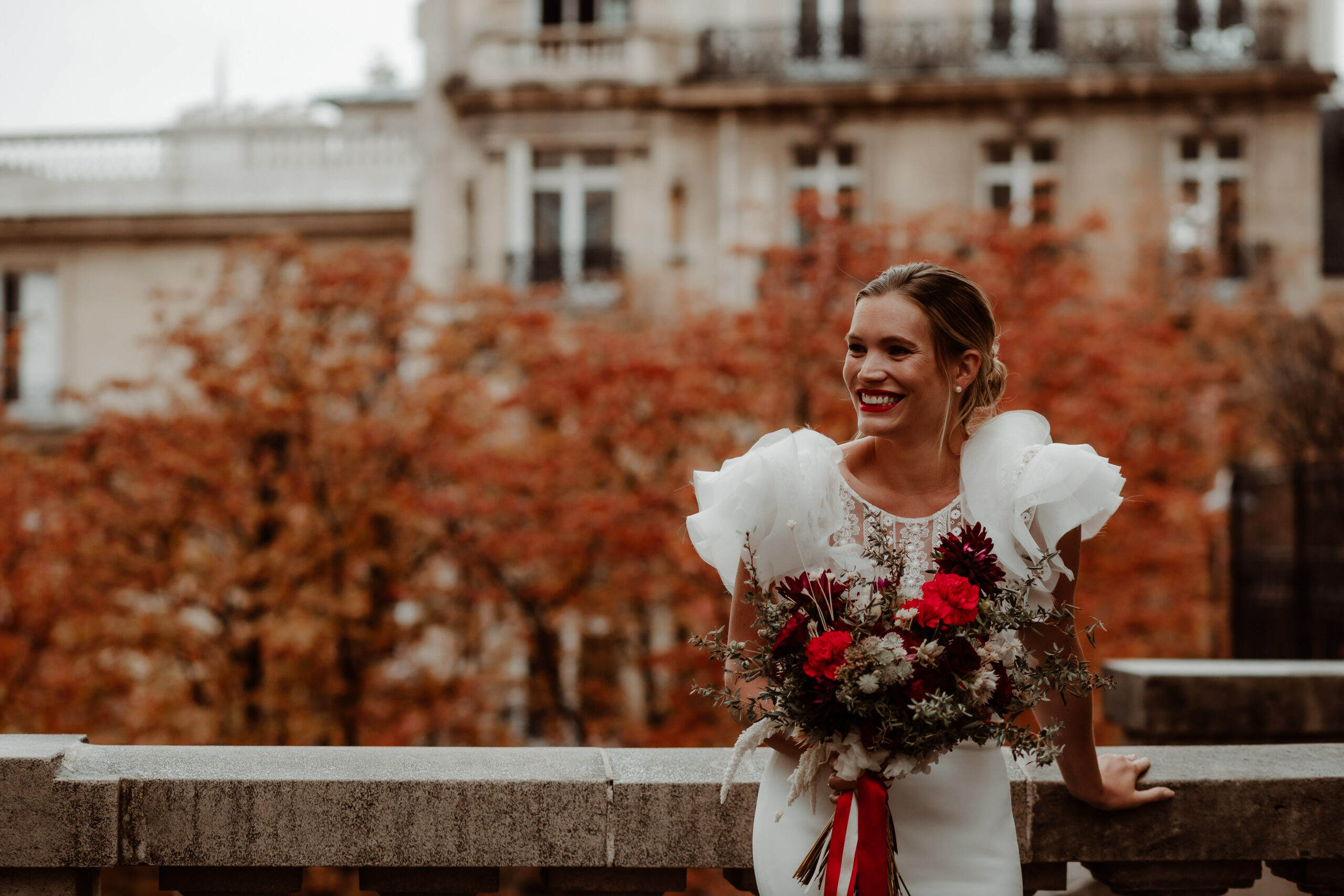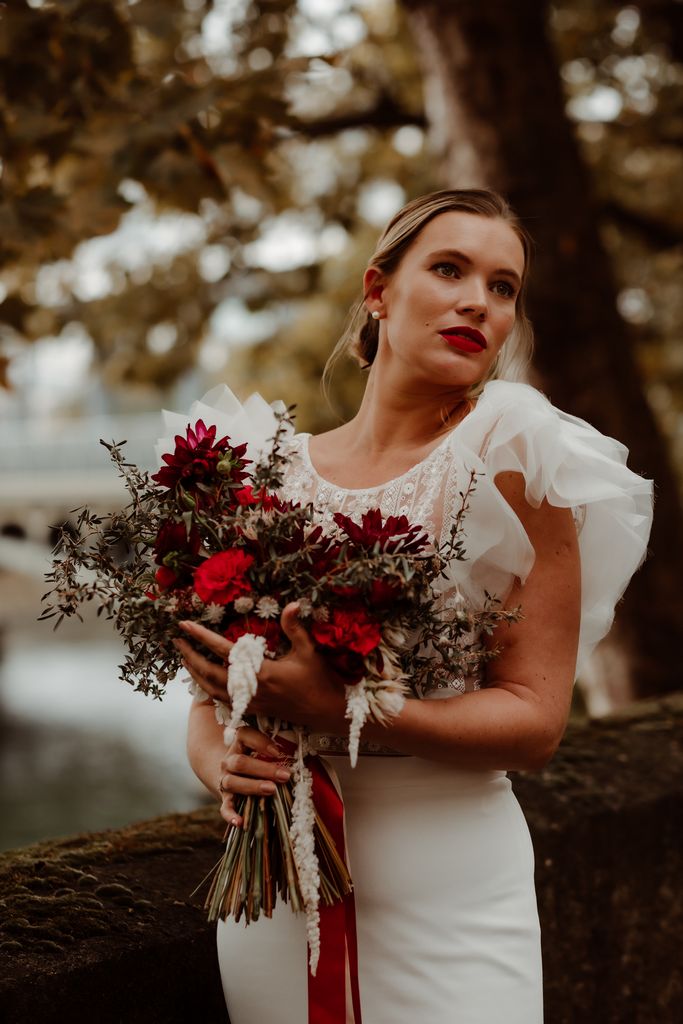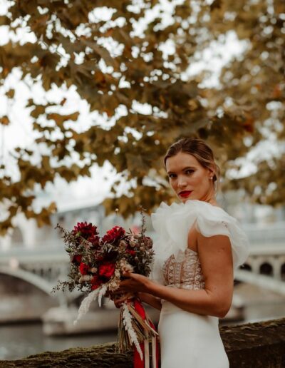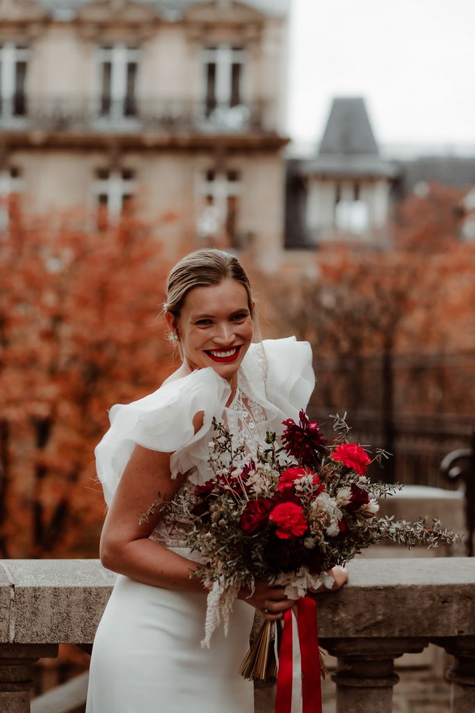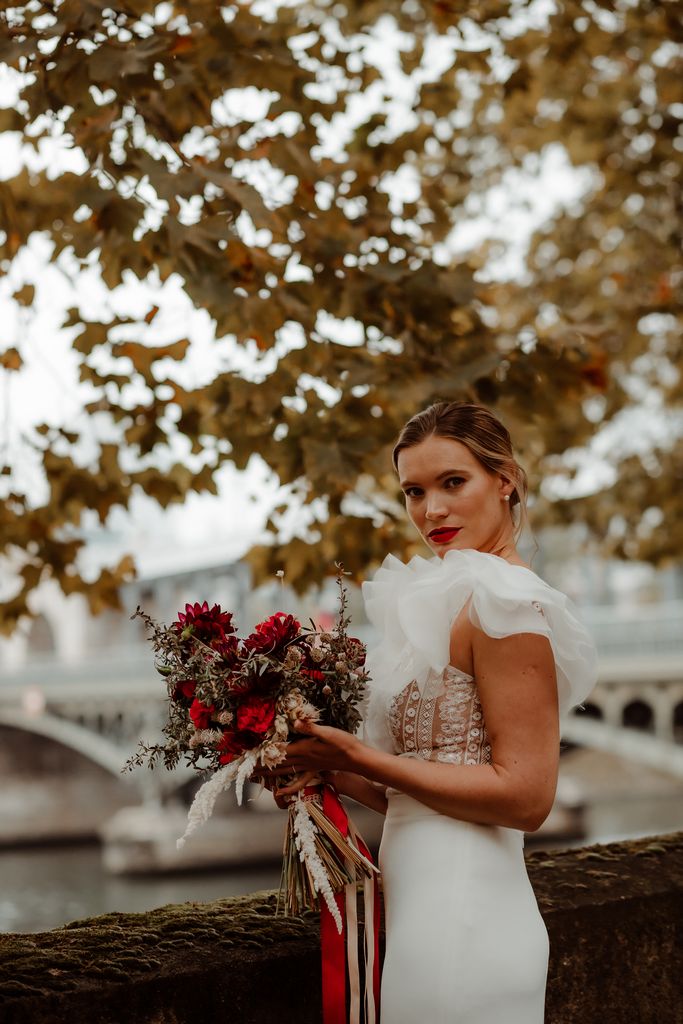 The metallic silhouette of the Eiffel Tower brings a strong, almost graphic contrast to the passionate red accents that set the tone: a fiery bouquet, a signature red lip, a confident allure.
