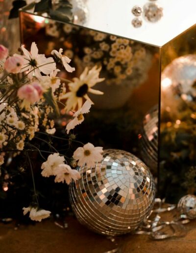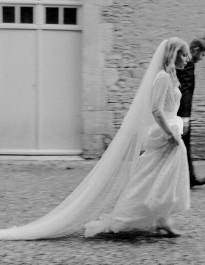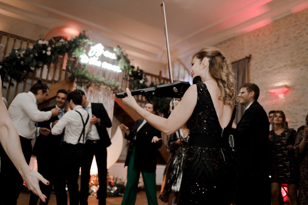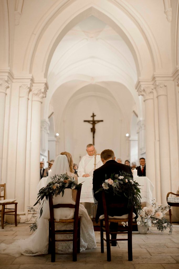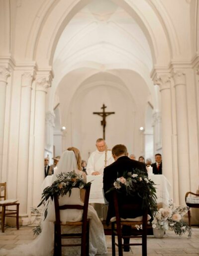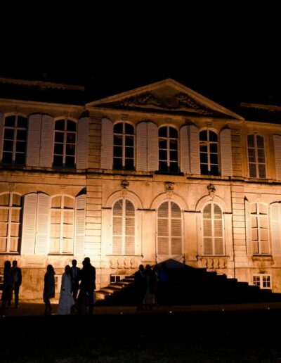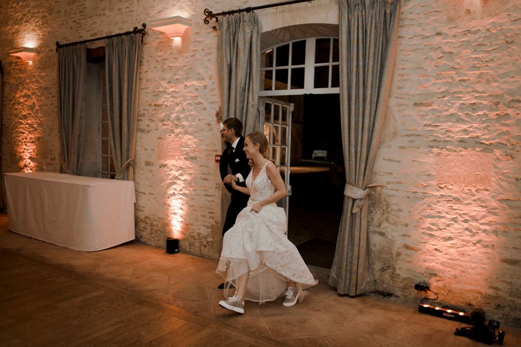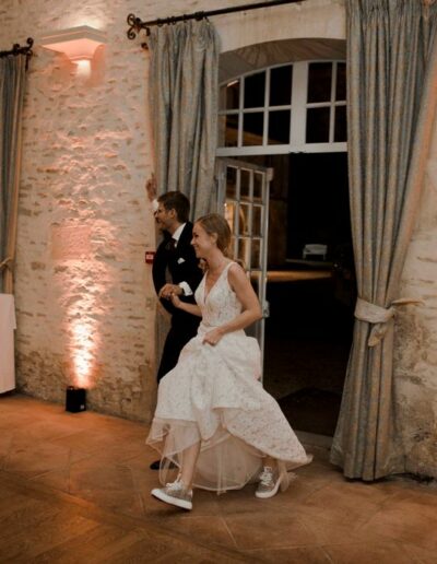 La célébration a débuté par une cérémonie religieuse dans une petite église nichée à quelques kilomètres. À la sortie, une haie d’honneur infiniment joyeuse les attendait. Le cocktail, était installé au pied du miroir d’eau, entre ciel couchant et reflet. Puis vint l’entrée en salle, rythmée par une violoniste électro qui a propulsé tout le monde sur le dancefloor, guidés par l’énergie de la mariée et ses iconiques baskets pailletées.