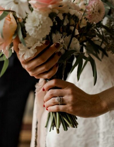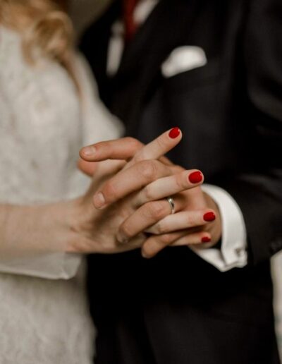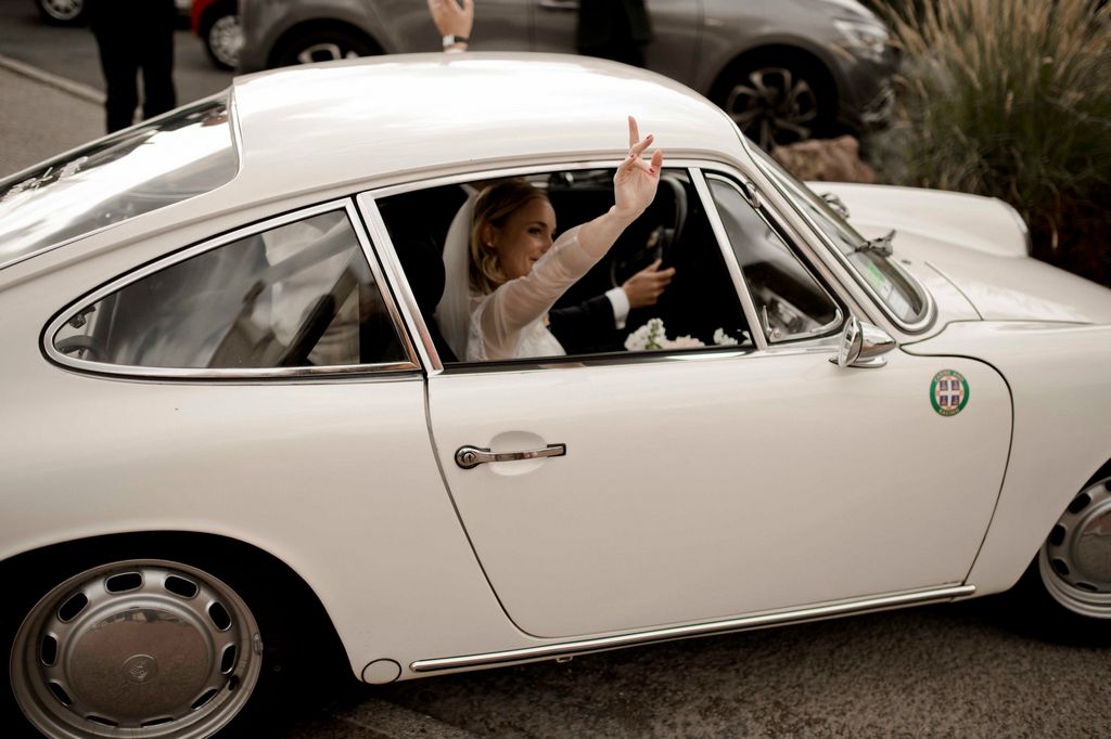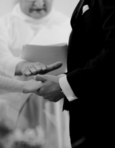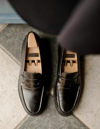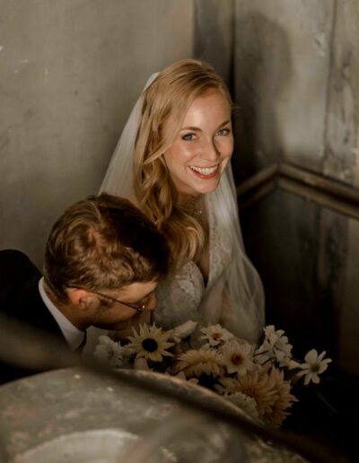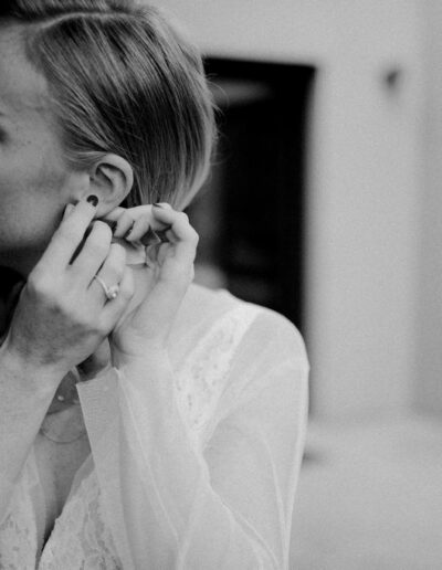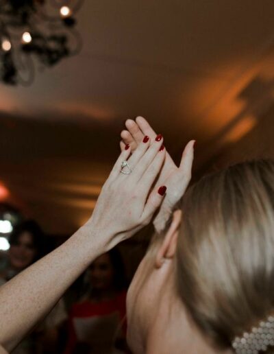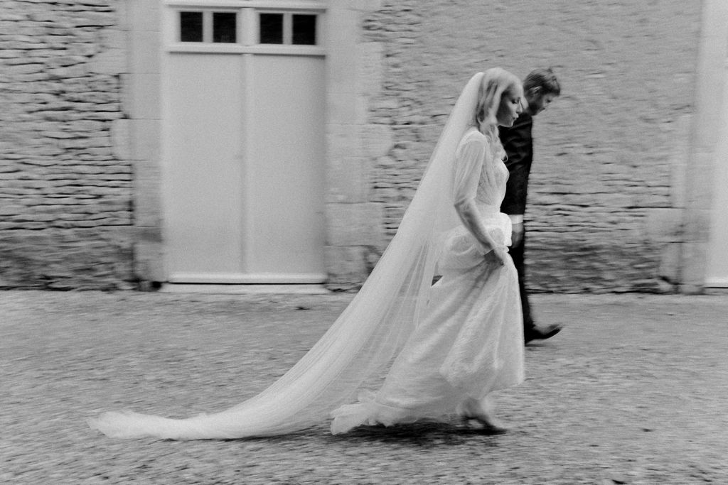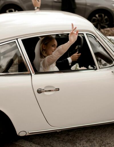 La célébration a débuté par une cérémonie religieuse dans une petite église nichée à quelques kilomètres. À la sortie, une haie d’honneur infiniment joyeuse les attendait. Le cocktail, était installé au pied du miroir d’eau, entre ciel couchant et reflet. Puis vint l’entrée en salle, rythmée par une violoniste électro qui a propulsé tout le monde sur le dancefloor, guidés par l’énergie de la mariée et ses iconiques baskets pailletées.