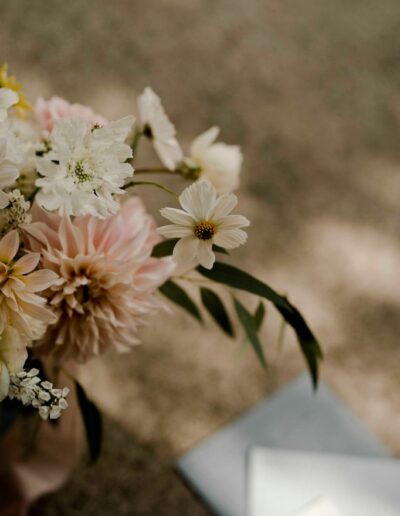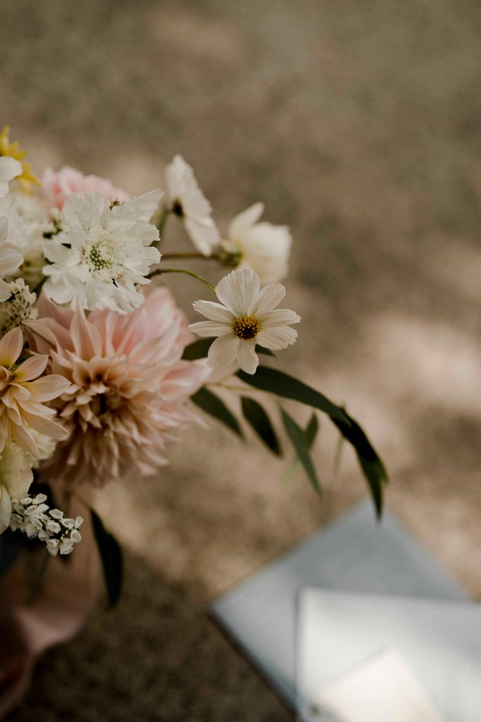 Une cérémonie en blanc, bleu et vert, fraîche, délicate.